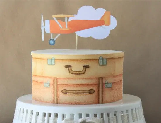 A single tier cake designed to look like stacked vintage suitcases with an orange airplane and cloud topper.