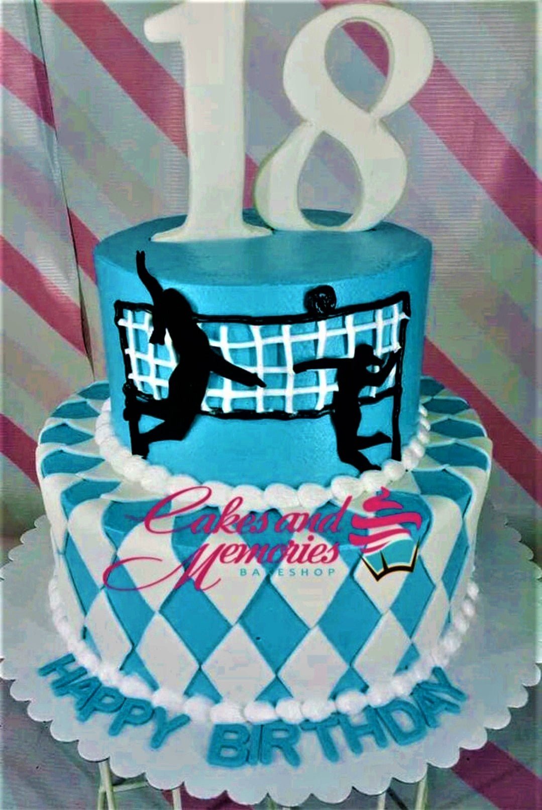 Two-tier blue and white volleyball themed birthday cake with a large number 18 topper and silhouette players.