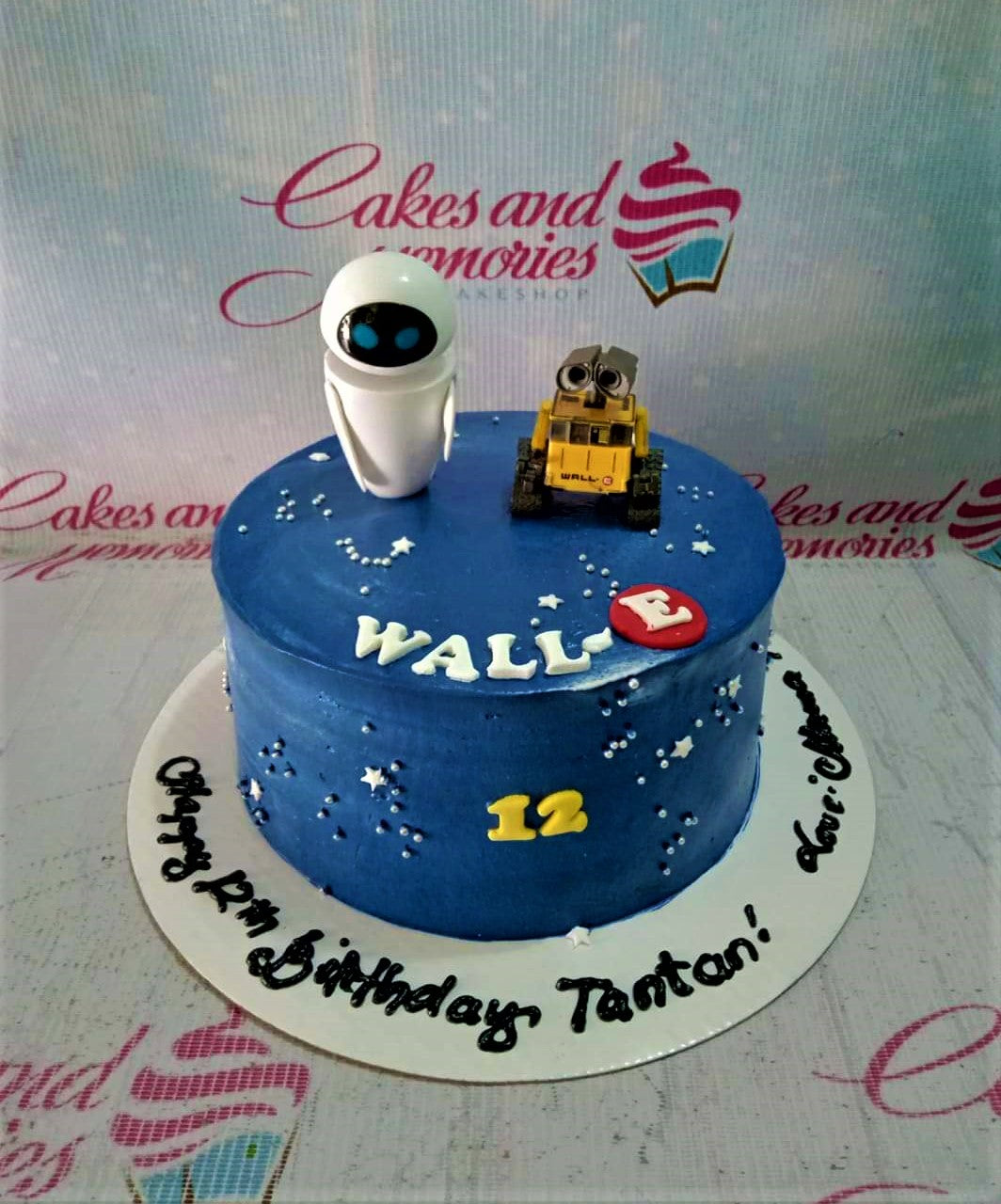Blue Wall-E and Eve themed birthday cake with space stars and character figurines.