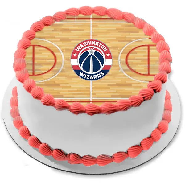 Washington Wizards basketball court themed cake with red icing borders and a printed court design on top.