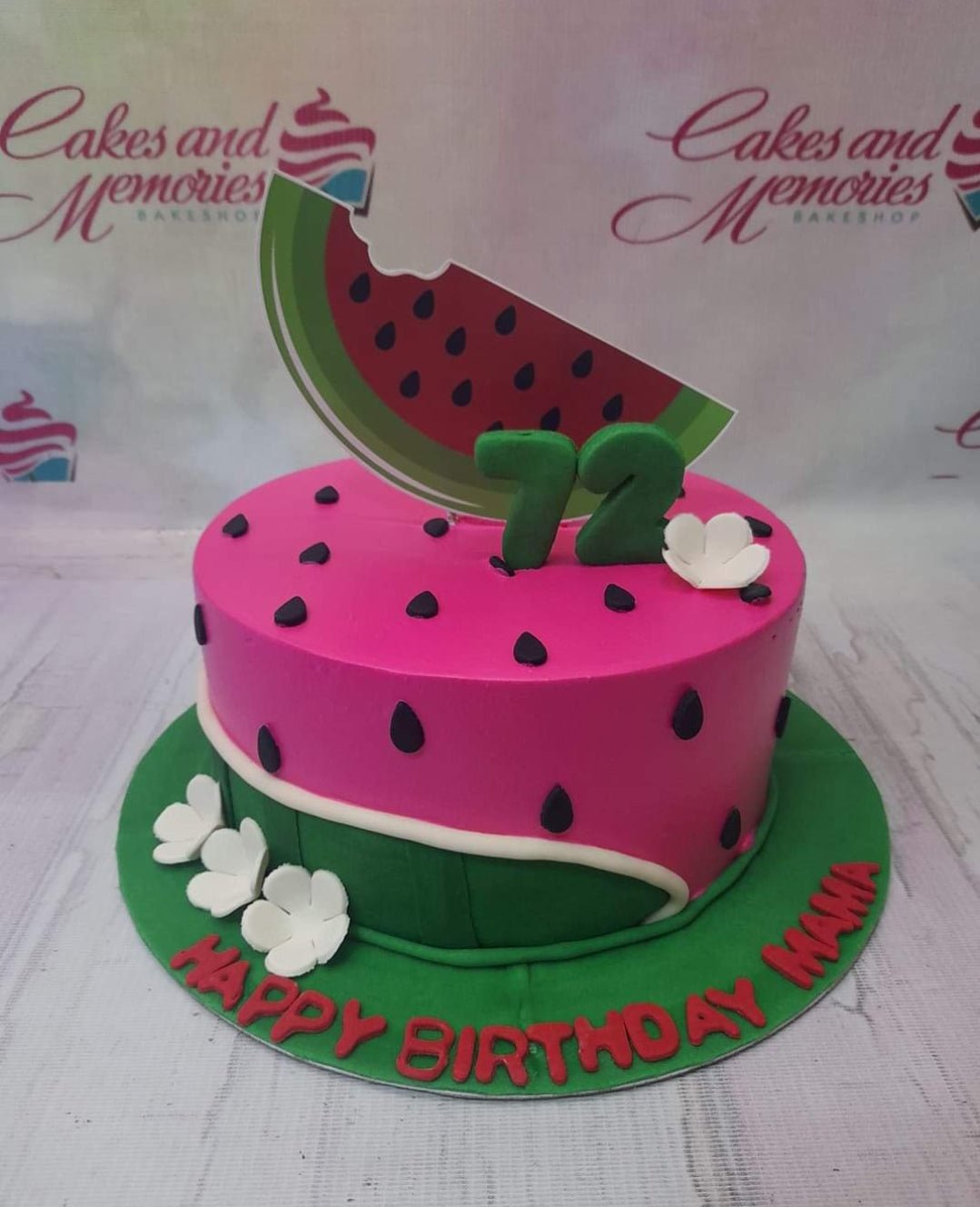 Watermelon themed birthday cake with pink icing, black seeds, green rind base, and a large watermelon slice topper for a 72nd birthday.