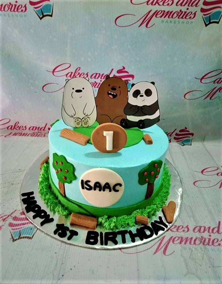 Light blue We Bare Bears themed birthday cake with fondant trees, logs, and character printouts for Isaac's 1st birthday.