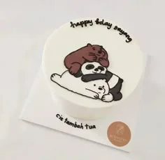 White bento cake featuring a hand-drawn icing illustration of We Bare Bears stacked on top of each other with black piped birthday messages.