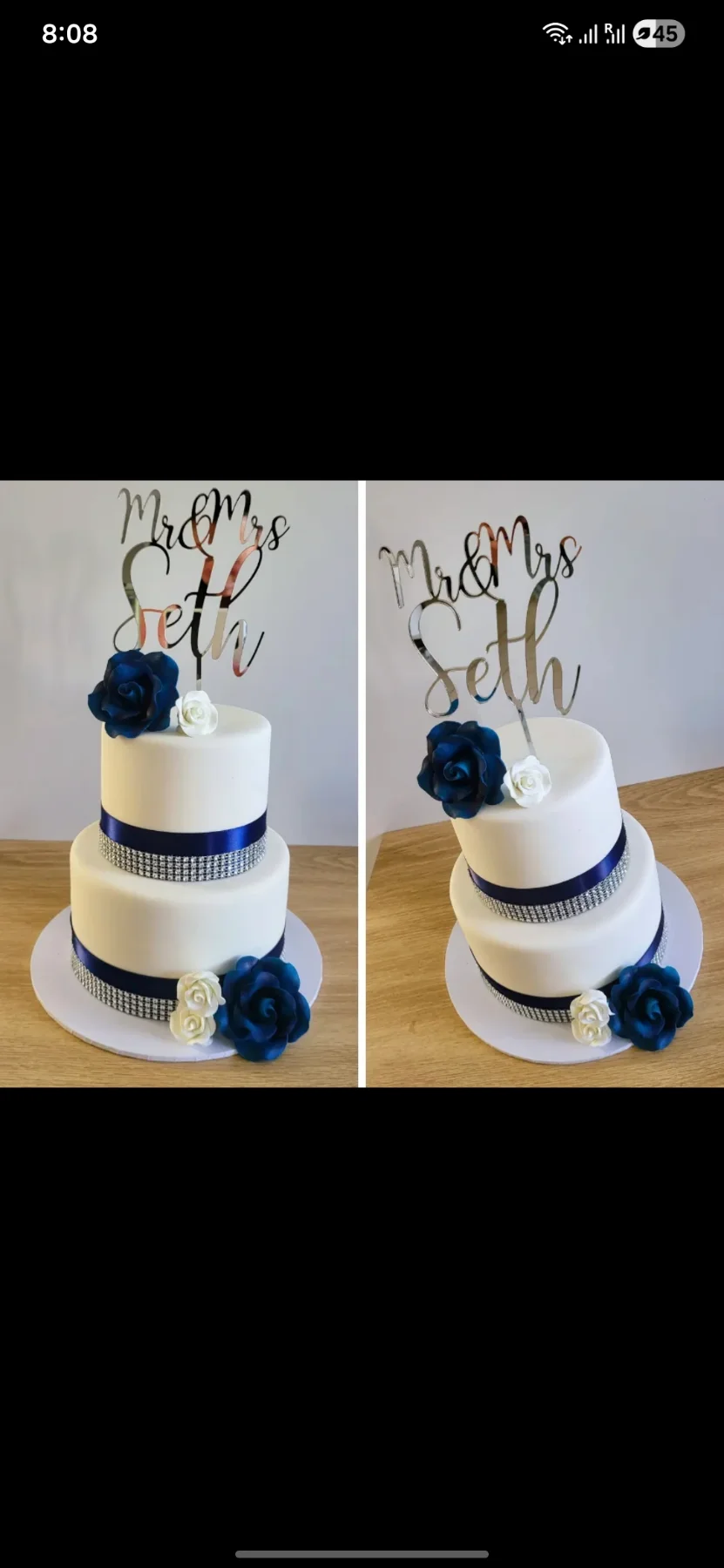 Cake 2 Tier Fondant - blue, dark, rose theme with Mr & Mrs Seth topper and dark blue roses