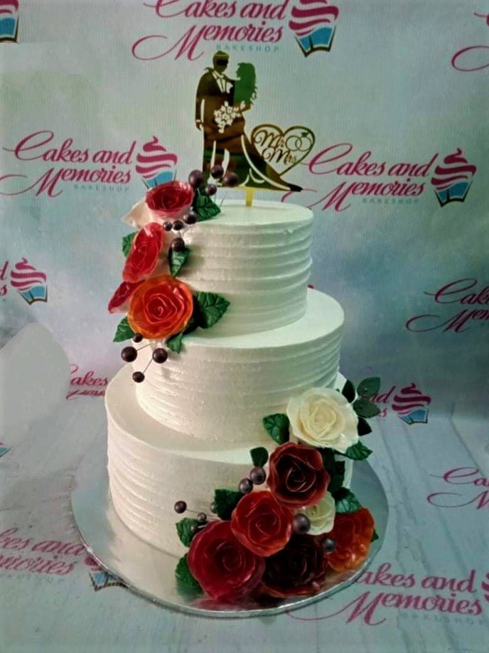 Elegant 3-tier white wedding cake with horizontal textured icing and cascading red and white roses.