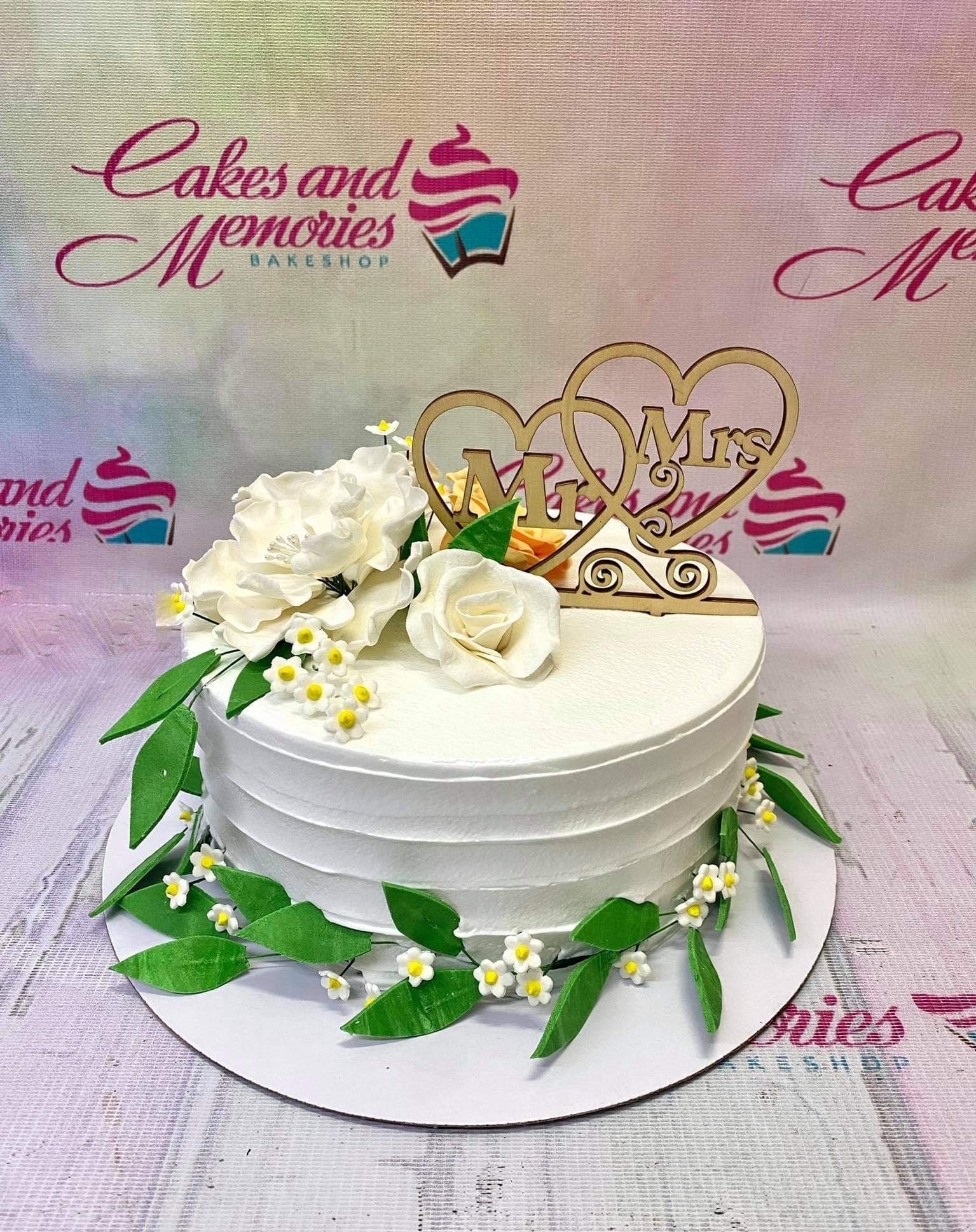 White 1-tier wedding cake with white and peach gumpaste flowers, green leaves, and a wooden Mr & Mrs heart topper.