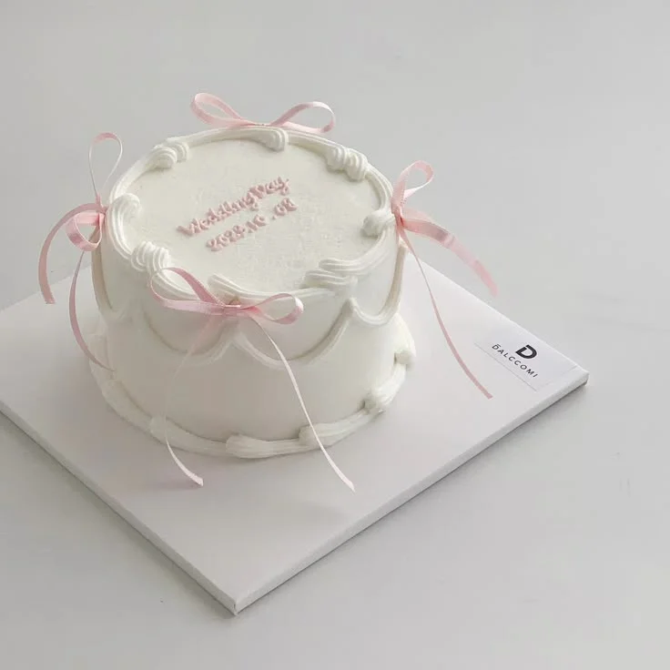 Minimalist white 1-tier cake with pink piped icing text and delicate pink satin ribbons on the sides.