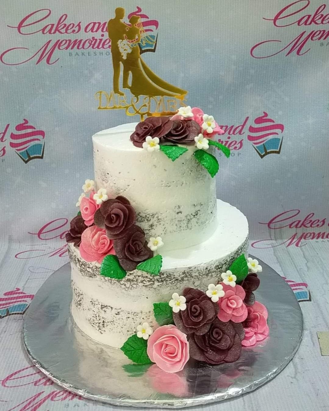 Two-tier semi-naked wedding cake with pink and dark red gumpaste roses and a gold bride and groom topper.
