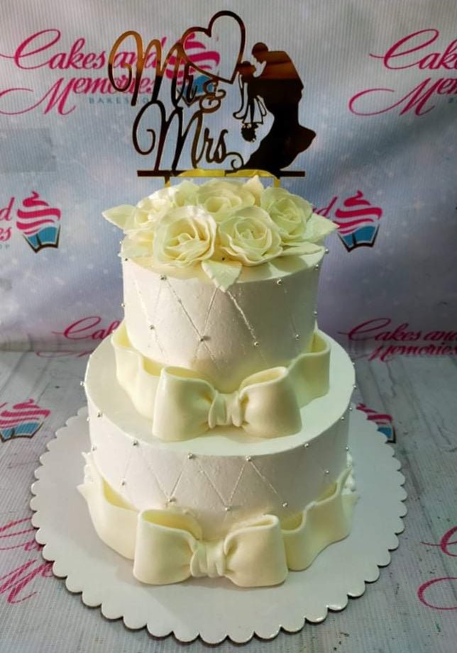 Elegant 2-tier white wedding cake with quilted icing, silver dragees, large cream fondant bows, and a gold Mr & Mrs topper.