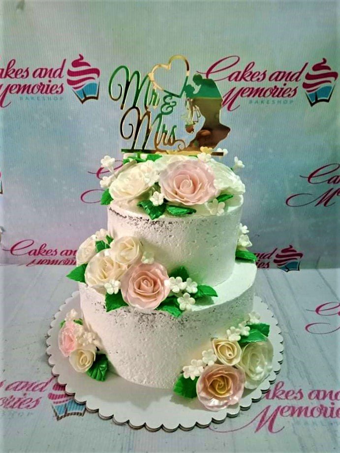 Two-tier semi-naked wedding cake with pink and white gumpaste roses and a gold Mr & Mrs topper.