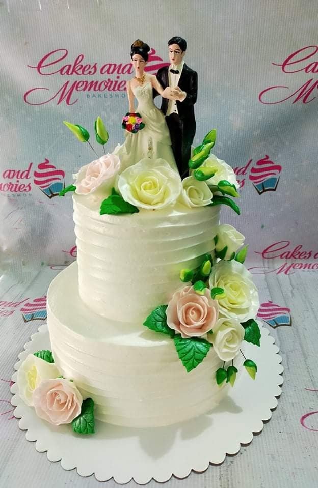 Elegant 2-tier white wedding cake with horizontal textured icing, decorated with white and pink sugar roses and a bride and groom topper.