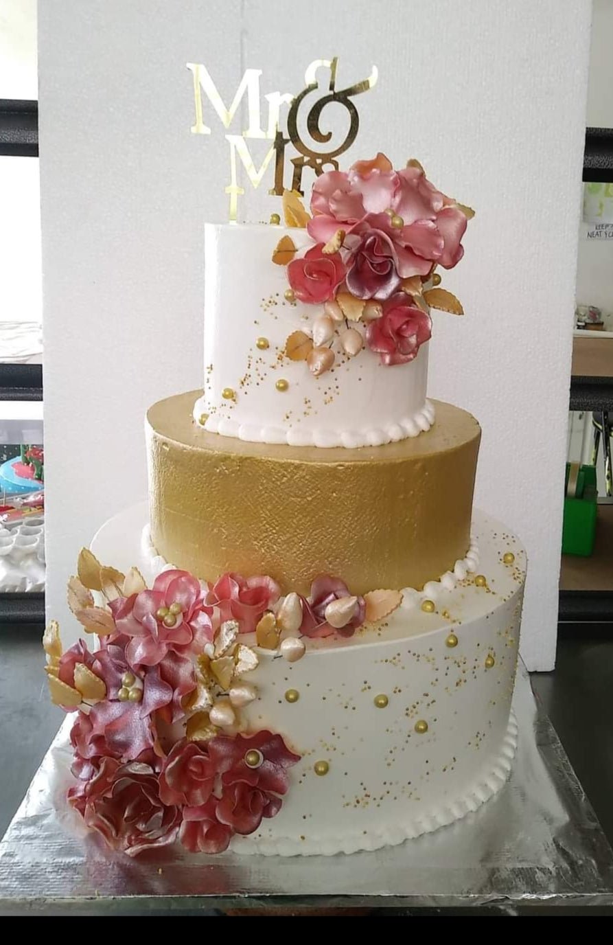 Elegant 3-tier wedding cake with white and gold icing, decorated with metallic pink and gold gumpaste roses and a gold Mr & Mrs topper.