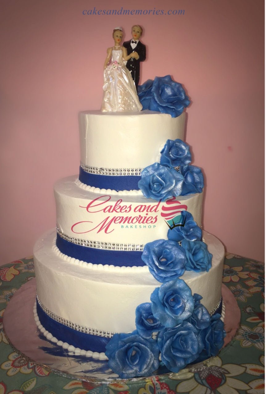 3-tier white wedding cake with royal blue ribbon bands, silver rhinestone borders, and a cascade of blue gumpaste roses topped with a bride and groom.