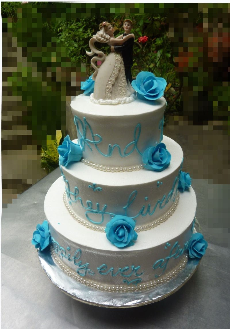 3-tier white wedding cake with blue icing roses, pearl borders, and a bride and groom topper.