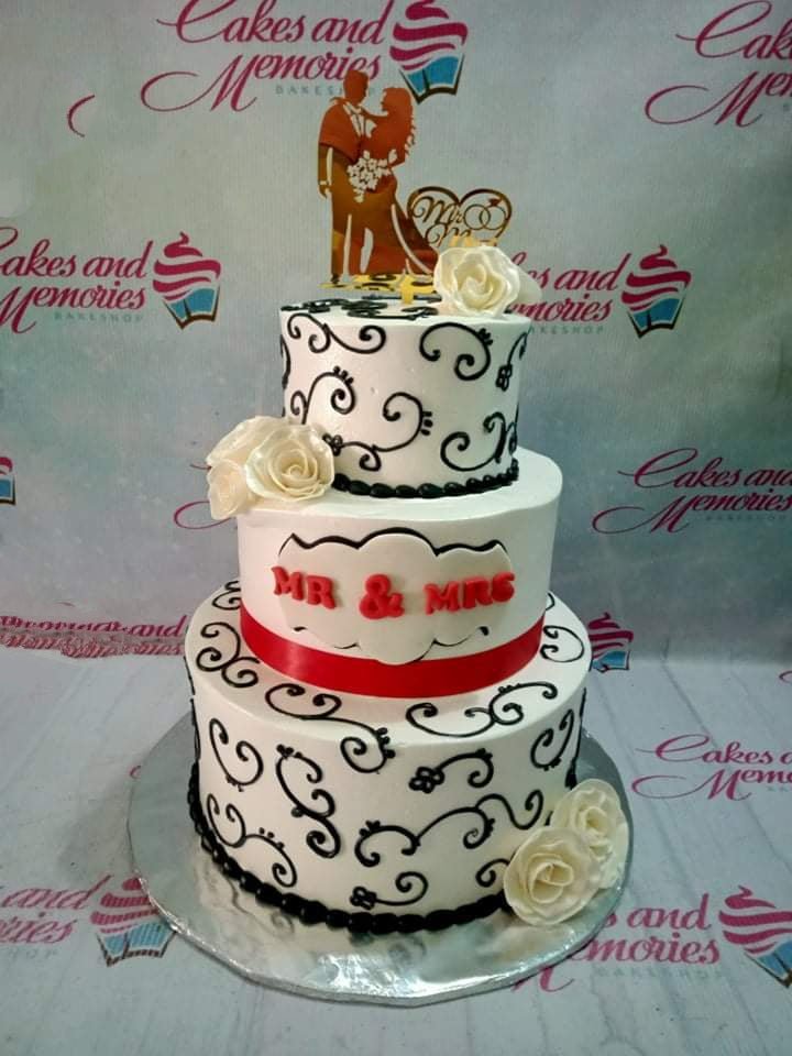 Elegant 3-tier white wedding cake with black scrollwork icing, red ribbon, and a gold Mr & Mrs couple topper with white roses.