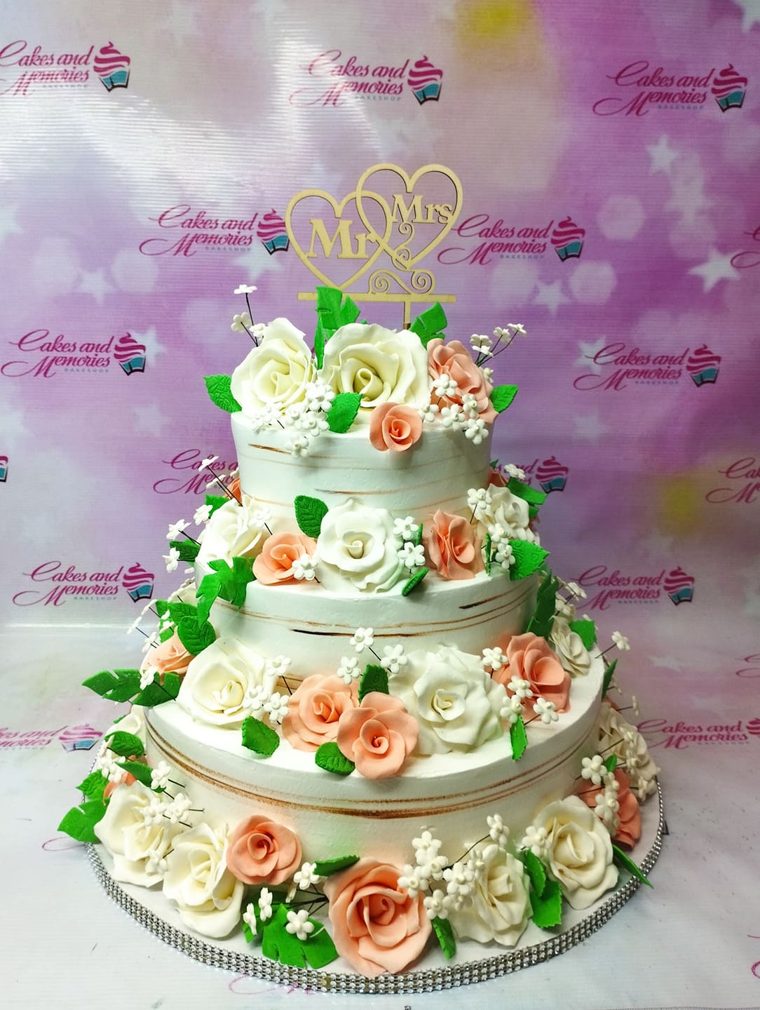 Elegant three-tier white wedding cake adorned with peach and white gumpaste roses and a wooden Mr and Mrs heart topper.