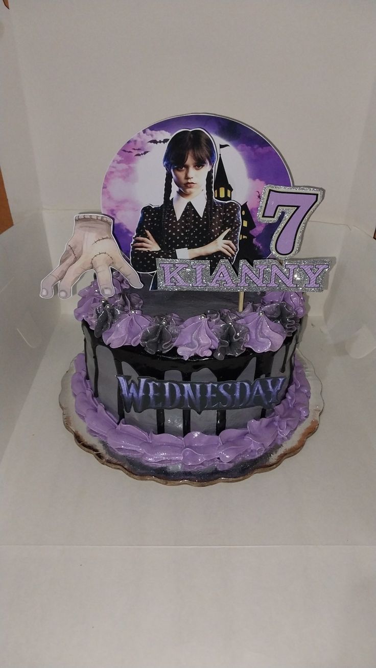 Wednesday Addams themed birthday cake with purple and black icing, chocolate drip, and character printouts.