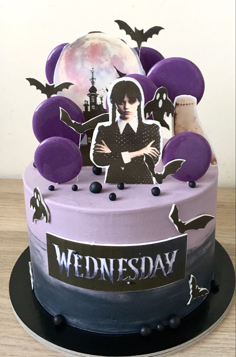 Wednesday Addams themed cake with purple and black gradient icing, purple lollipops, and character printouts.