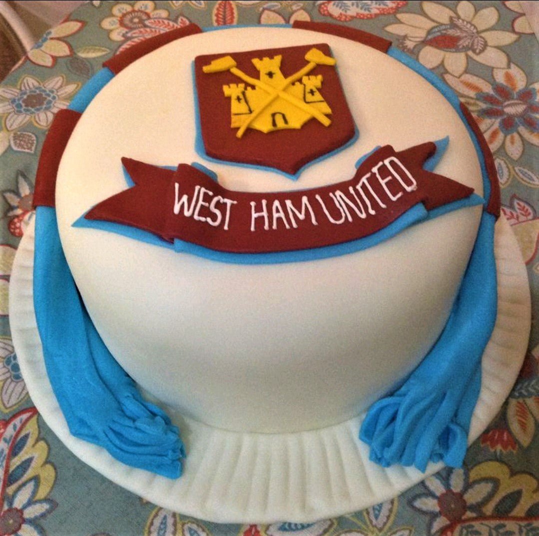 West Ham United football club themed fondant cake with a maroon shield crest and a blue scarf decoration.