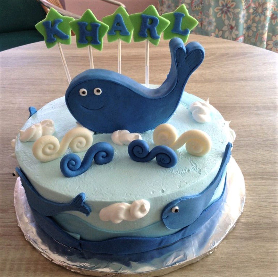 Light blue whale themed birthday cake with a large blue fondant whale topper and white icing waves.