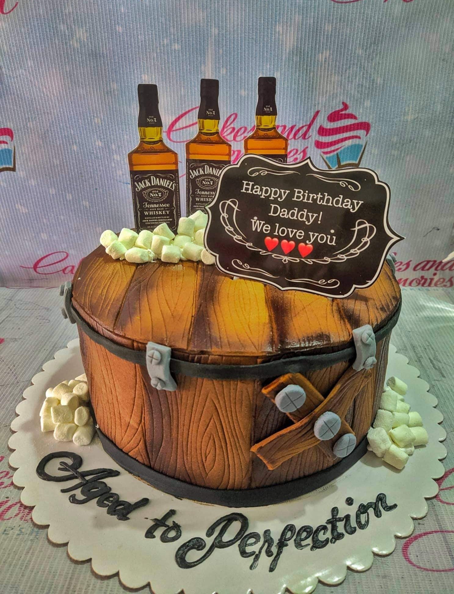 Jack Daniel's whiskey barrel cake with fondant wood grain texture, mini marshmallows, and printed whiskey bottle toppers.