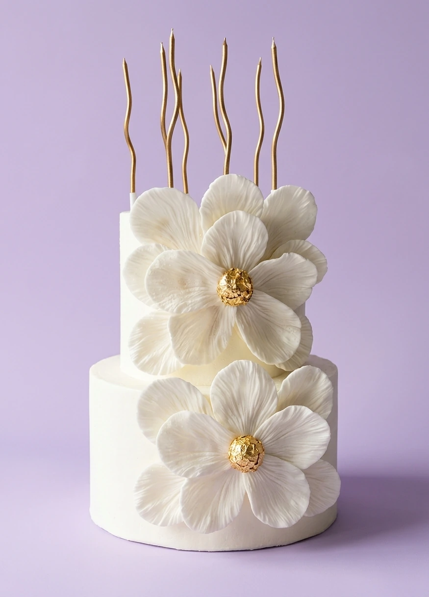 Elegant white minimalist cake featuring large white gumpaste flowers with gold centers and tall wavy gold candles.