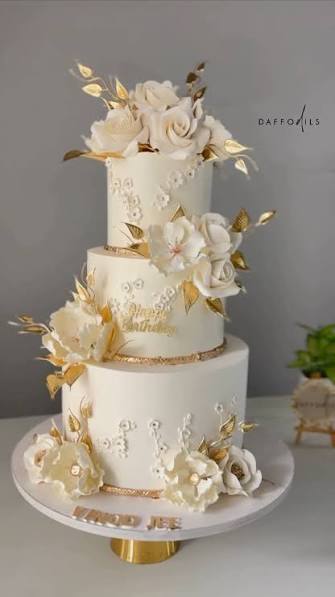 Elegant 3-tier white floral birthday cake with gold leaves and white gumpaste flowers on a white base.