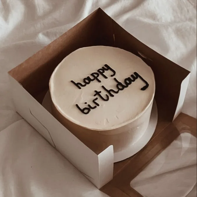 Minimalist white bento cake with black piped icing text saying Happy Birthday in a brown box.