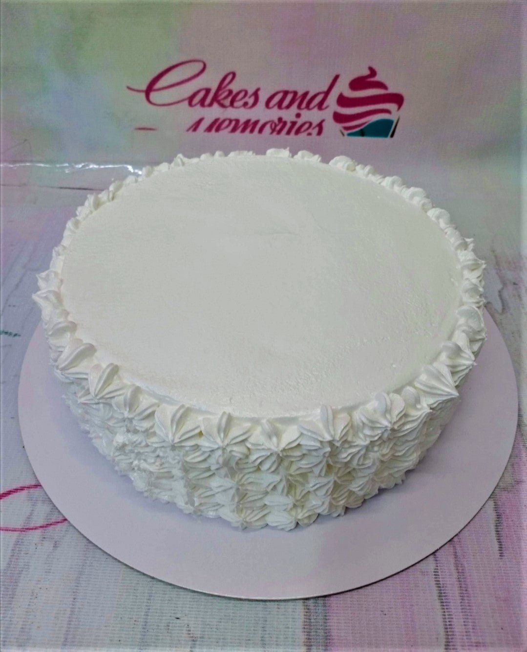 Elegant all-white minimalist cake with intricate piped icing rosettes covering the sides and a smooth top surface.