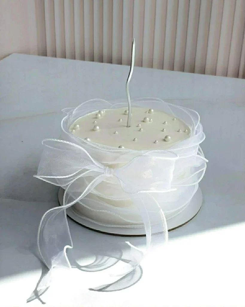 Minimalist white cake with a tall silver candle, pearl sprinkles, and a large white organza ribbon wrap.