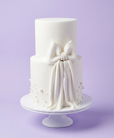 Elegant all-white two-tier fondant cake featuring a large sculpted fondant bow and pearl dragees on a white base.