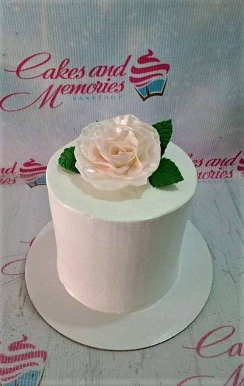 Elegant white minimalist cake topped with a large white gumpaste rose and green leaves.
