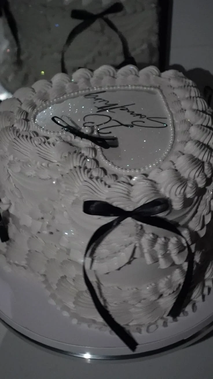 White heart-shaped vintage cake with intricate piped ruffles, black satin bows, and a personalized message on top.