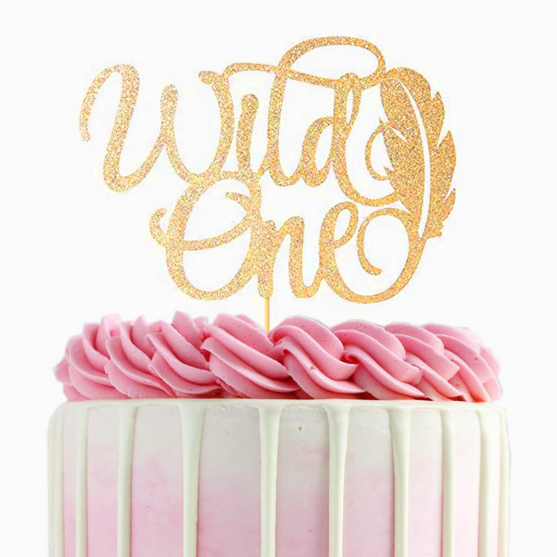 Pink and white ombre cake with white chocolate drip, pink icing rosettes, and a gold glitter Wild One topper.