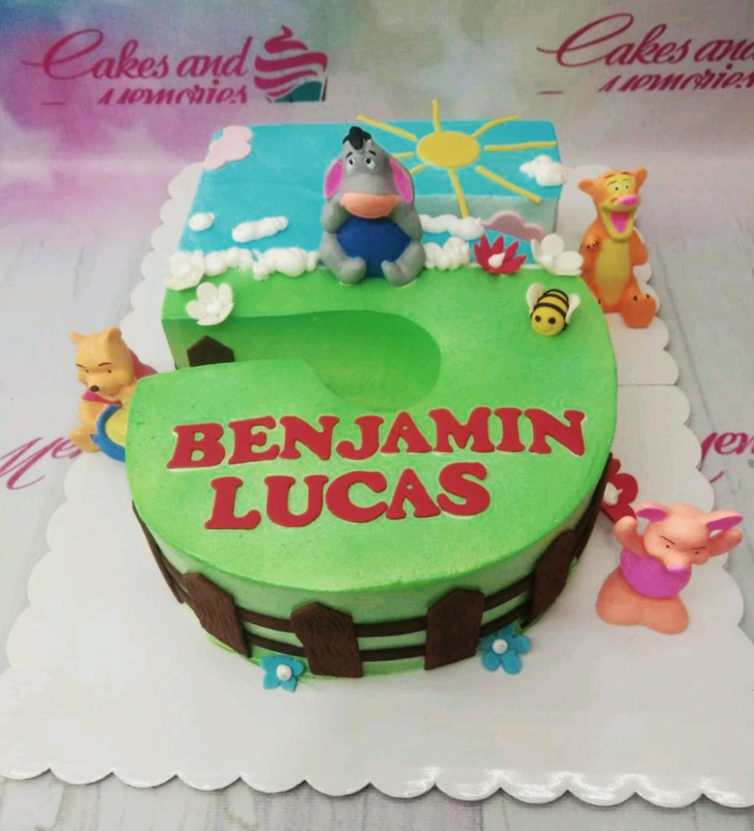 Number 5 shaped Winnie the Pooh themed cake with Eeyore, Tigger, and Piglet figurines on a green and blue landscape.