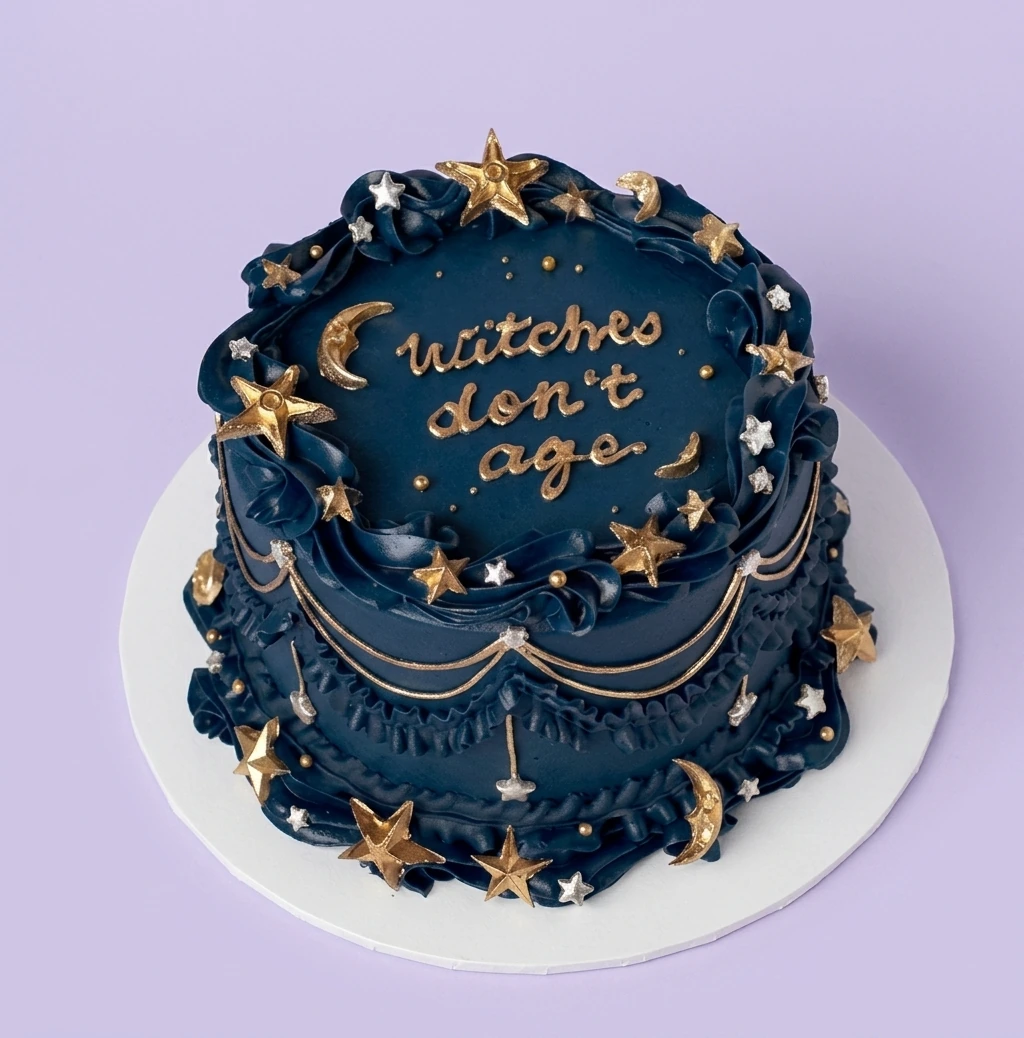 Navy blue minimalist cake with gold icing text 'Witches don't age' and gold and silver star and moon decorations.