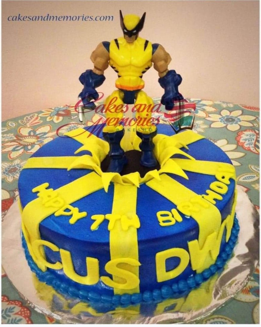 Blue Wolverine superhero birthday cake with yellow fondant stripes and a 3D Wolverine action figure on top.