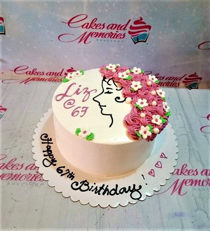 White minimalist cake with a piped icing silhouette of a woman with pink floral hair and a birthday message.