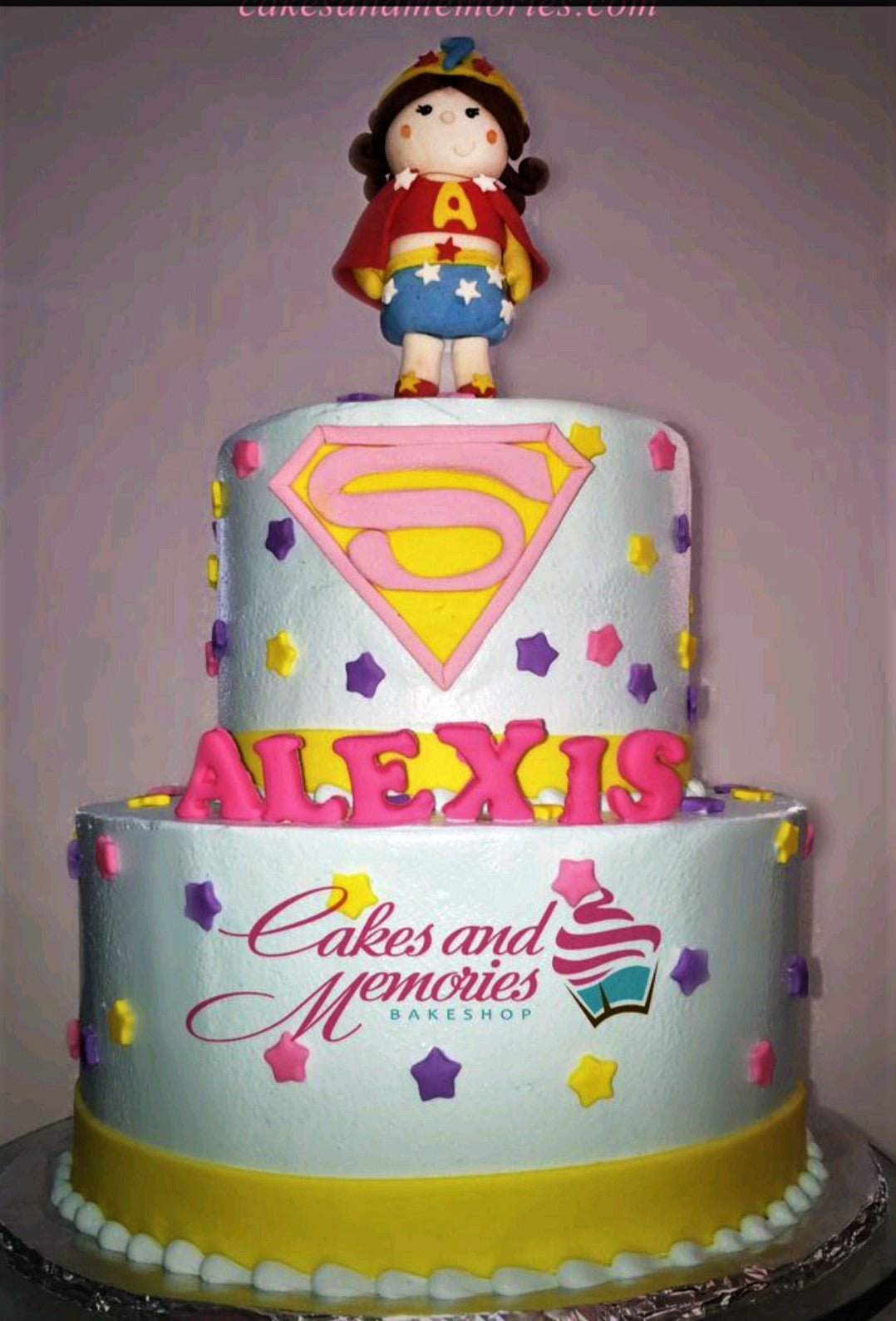 Two-tier light blue fondant cake with a Wonder Woman style girl topper, pink Superman logo, and colorful fondant stars.