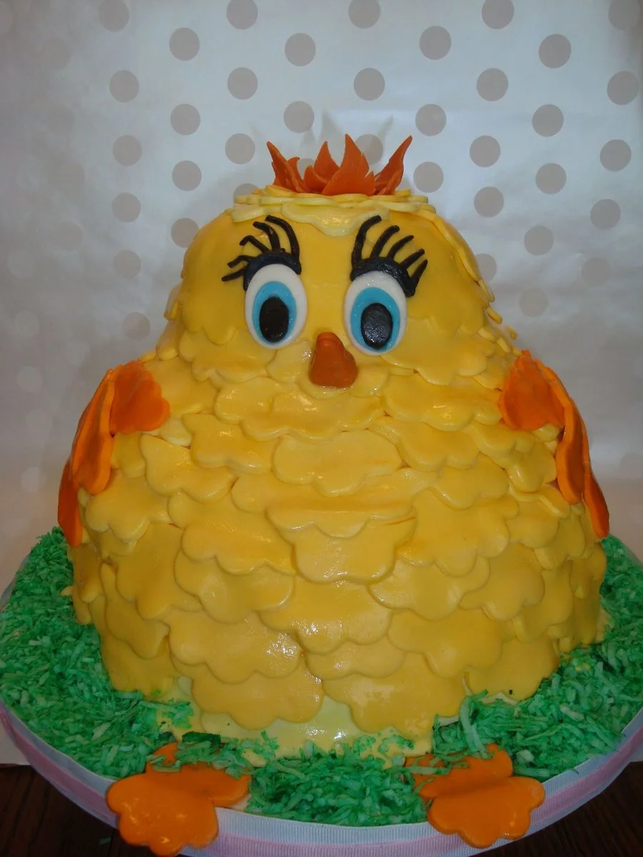 Yellow chick-shaped fondant cake with orange wings, a small orange crest, and large blue eyes, sitting on a green coconut-shred grass base.