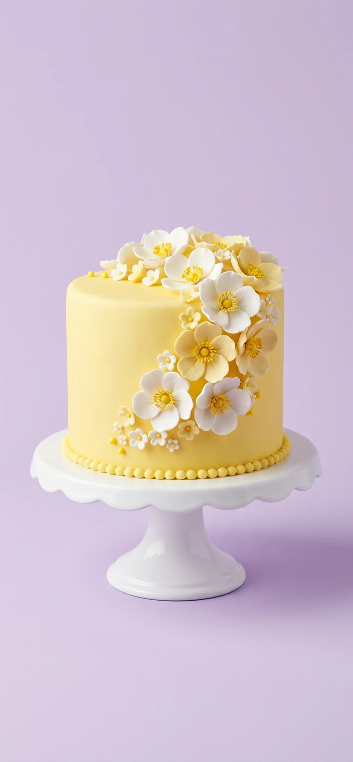 Yellow minimalist cake decorated with white and yellow gumpaste flowers and small yellow icing beads at the base.