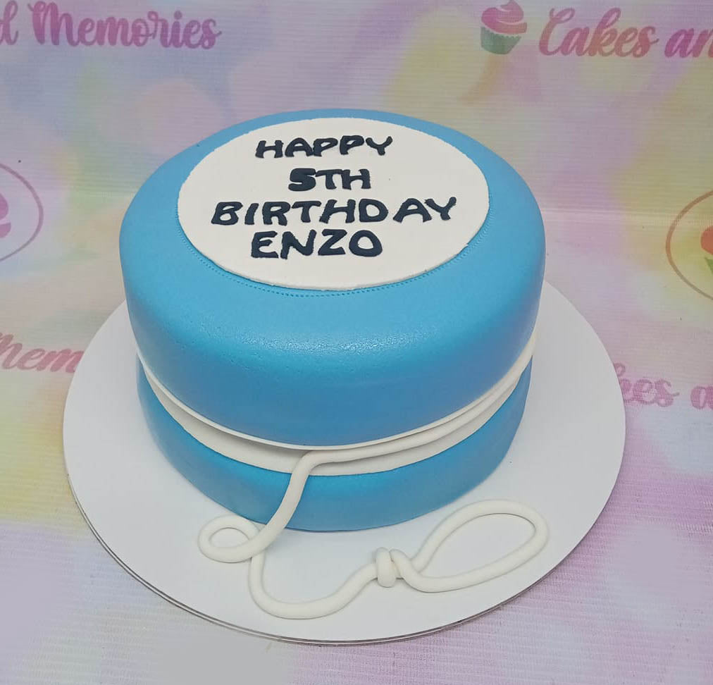 Blue yo-yo shaped fondant cake with a white string and a birthday message for Enzo.