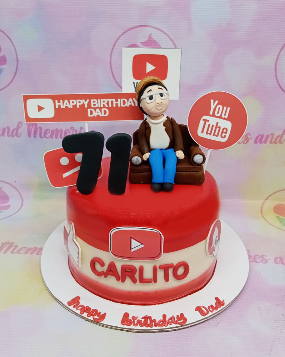 Red and white YouTube themed birthday cake for Carlito's 71st birthday with a custom fondant man figurine sitting on a sofa.
