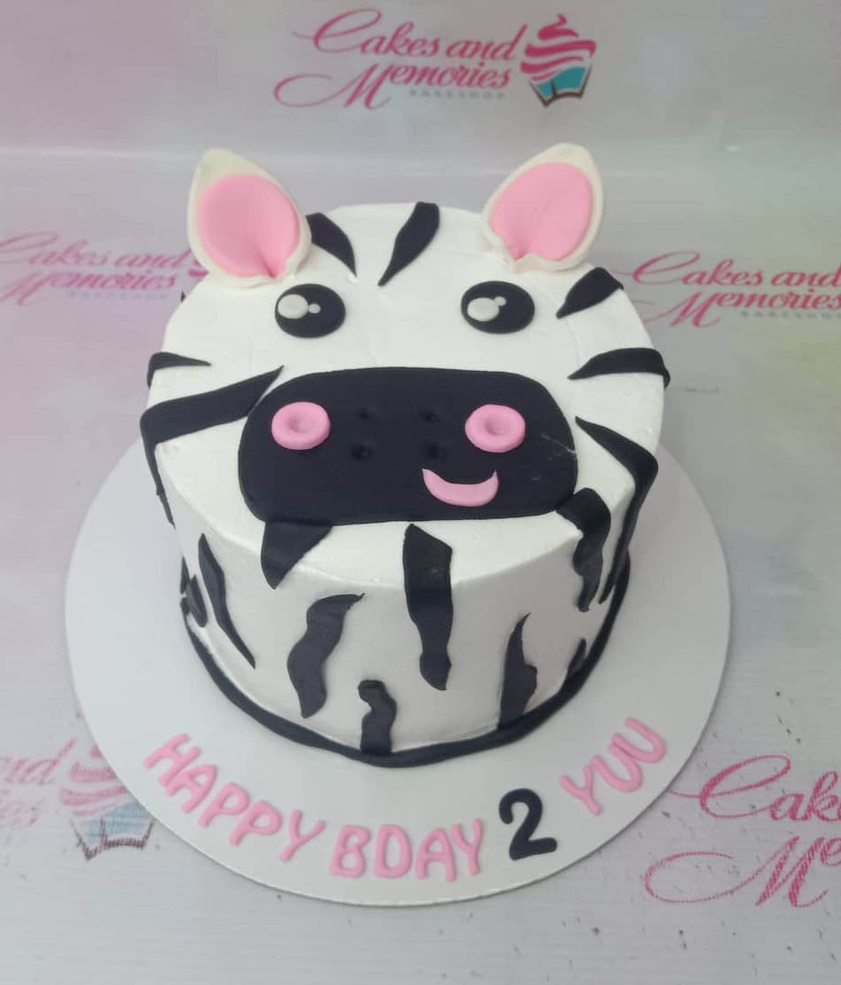 White zebra-themed birthday cake with black fondant stripes, pink ears, and a cute face on a white base board.