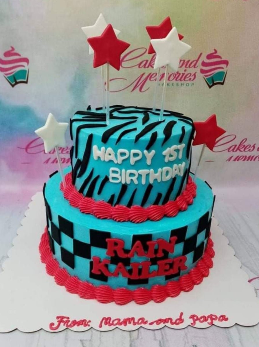 Two-tier blue birthday cake with zebra stripes, checkered patterns, and red and white star toppers.
