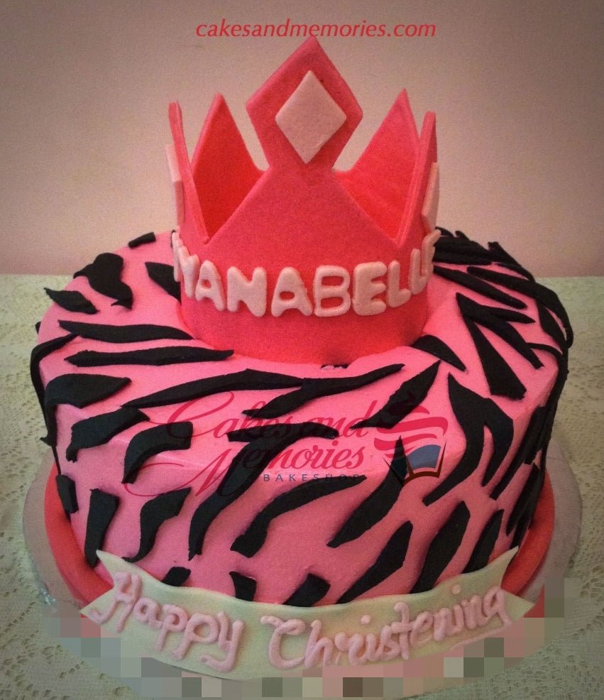 Pink 1-tier fondant cake with black zebra stripes and a large pink fondant crown topper.