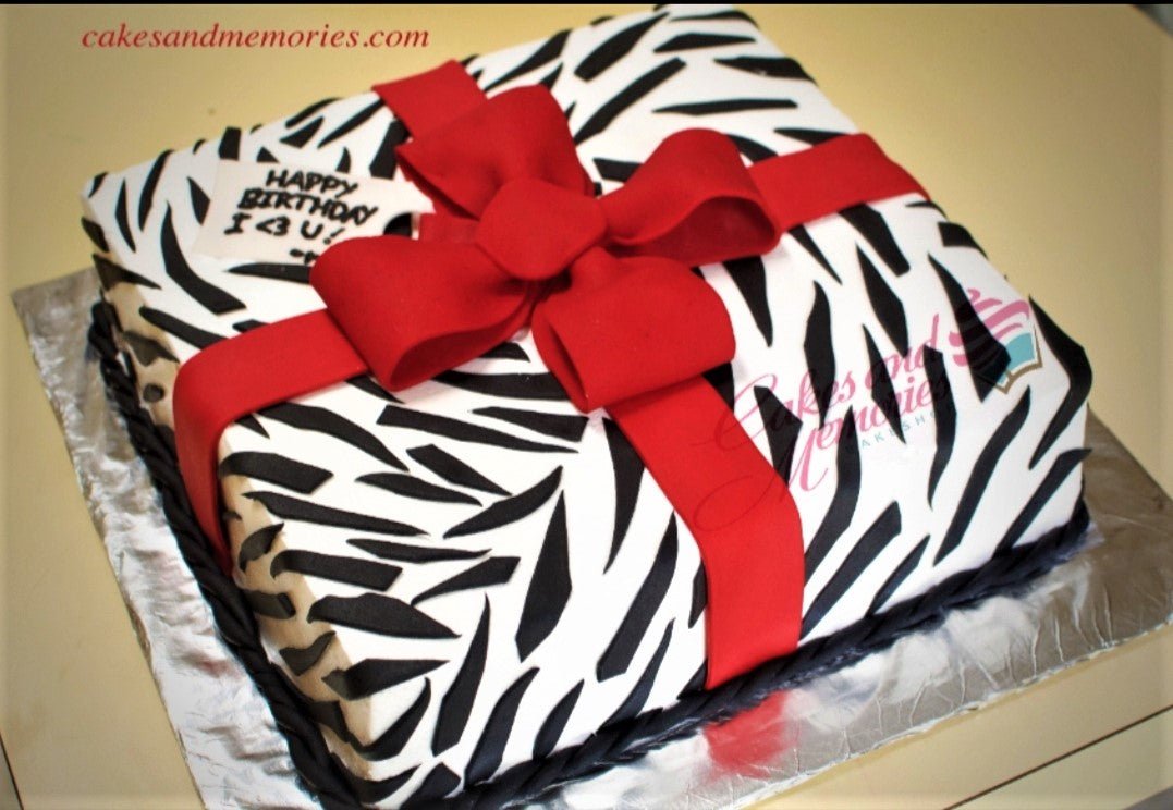 Square zebra print fondant cake with a large red fondant bow and a birthday message tag.