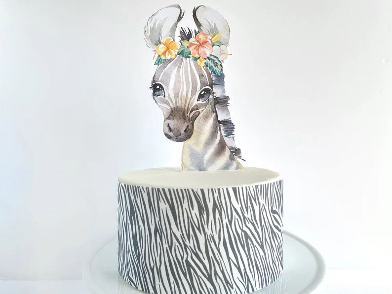White fondant cake with a zebra print side wrap and a watercolor zebra printout topper wearing a floral crown.