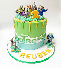 Zootopia themed birthday cake with green and blue icing, yellow drip, and various character figurines on top and around the base.