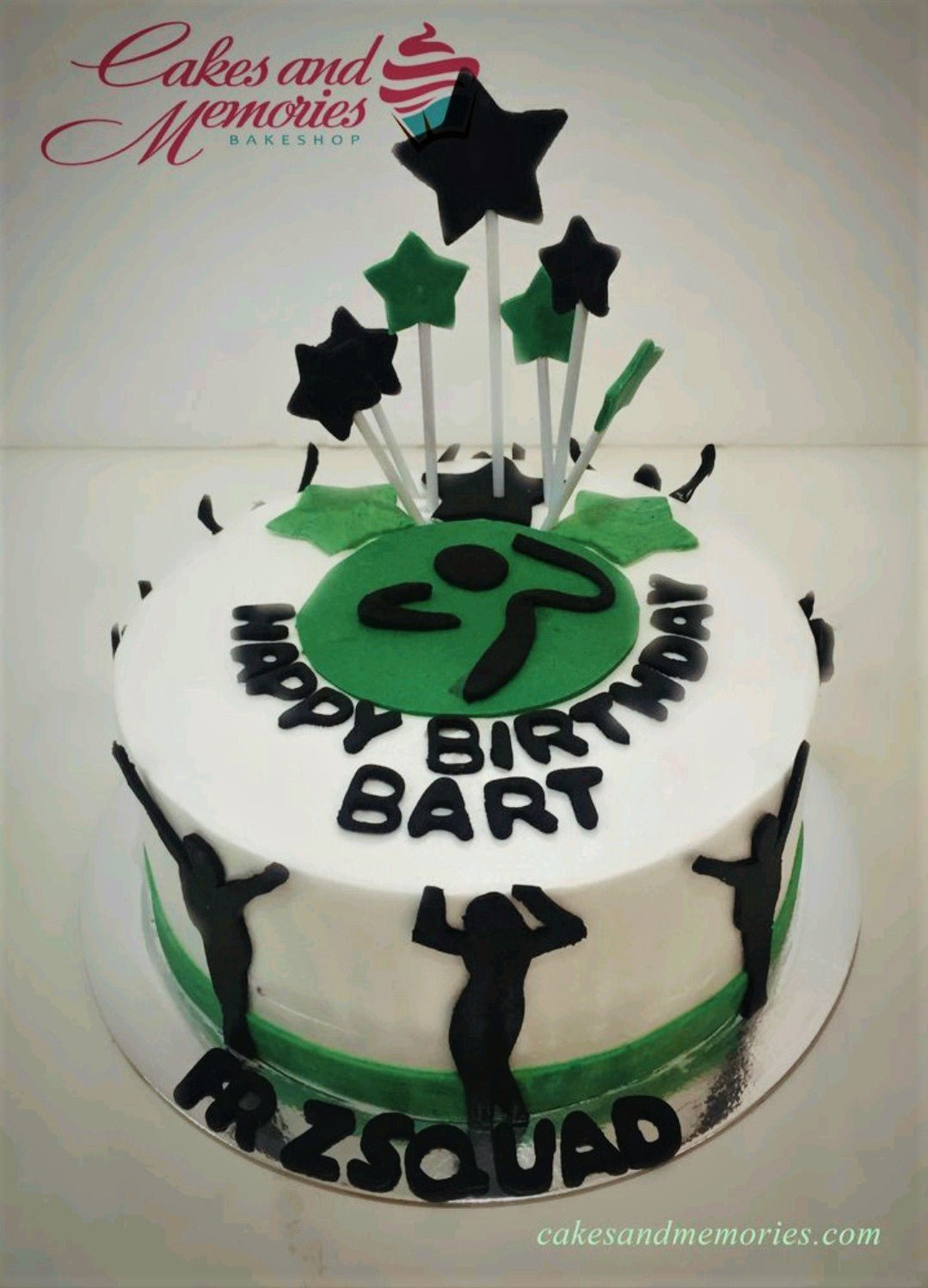 White round cake with green and black star toppers and silhouettes of people dancing for a Zumba themed birthday.